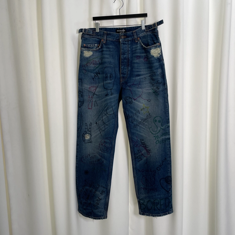 블루 두들 프린트 디스트레스드 데님 진