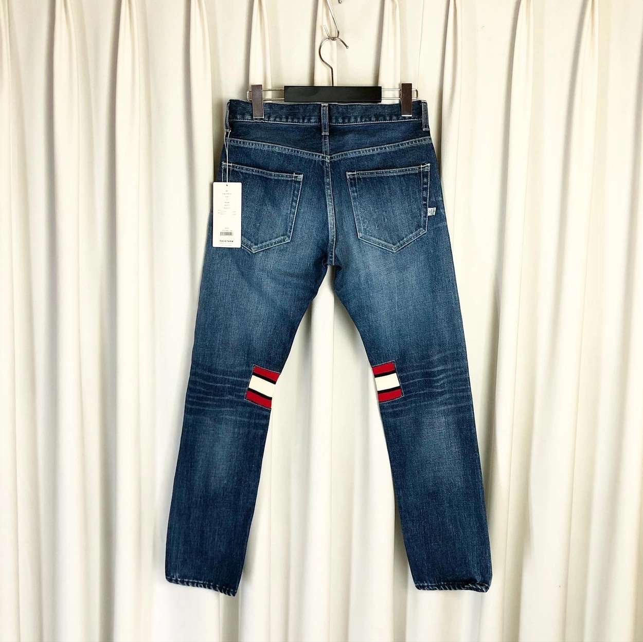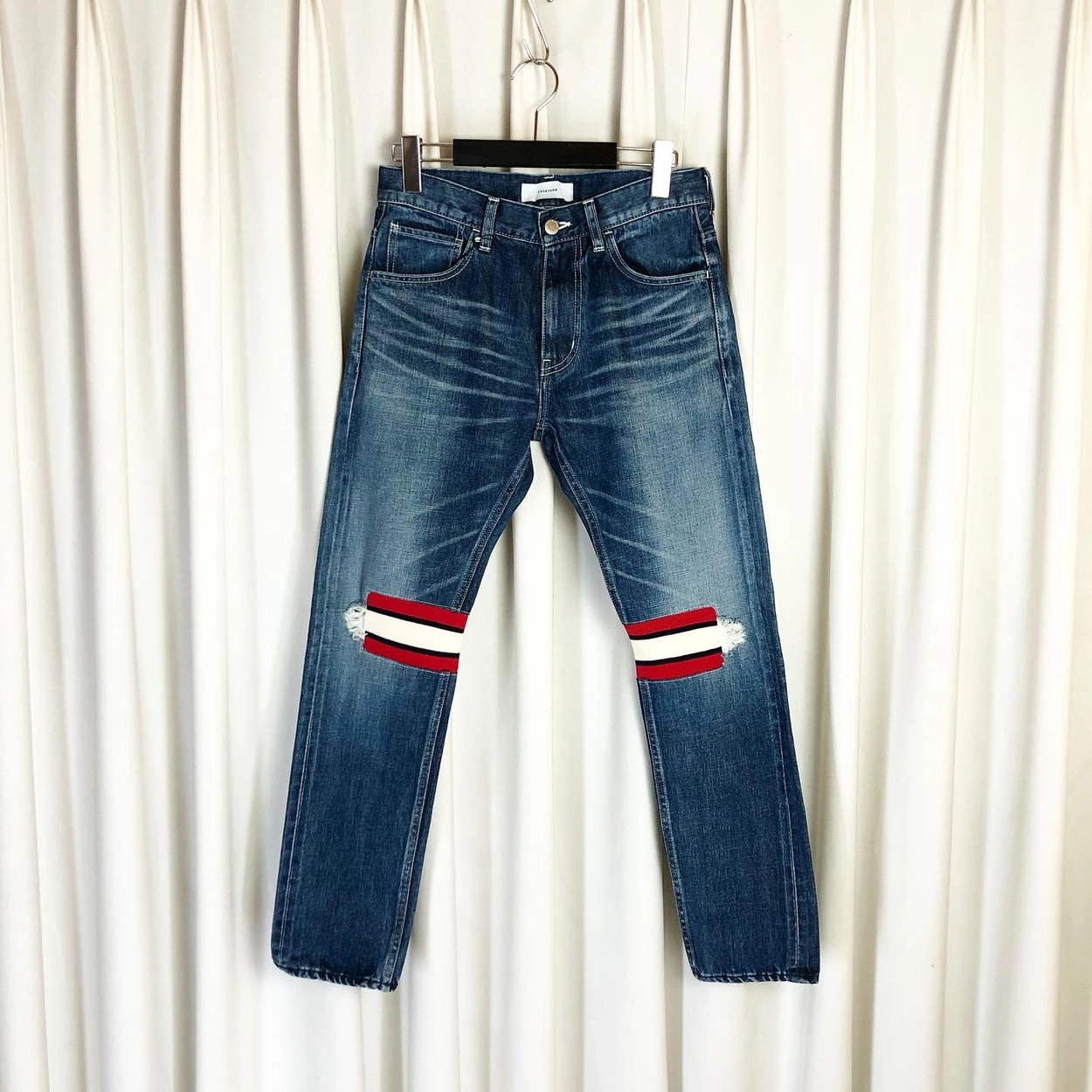 Blue washed jeans slim fit + signature rib details on knees