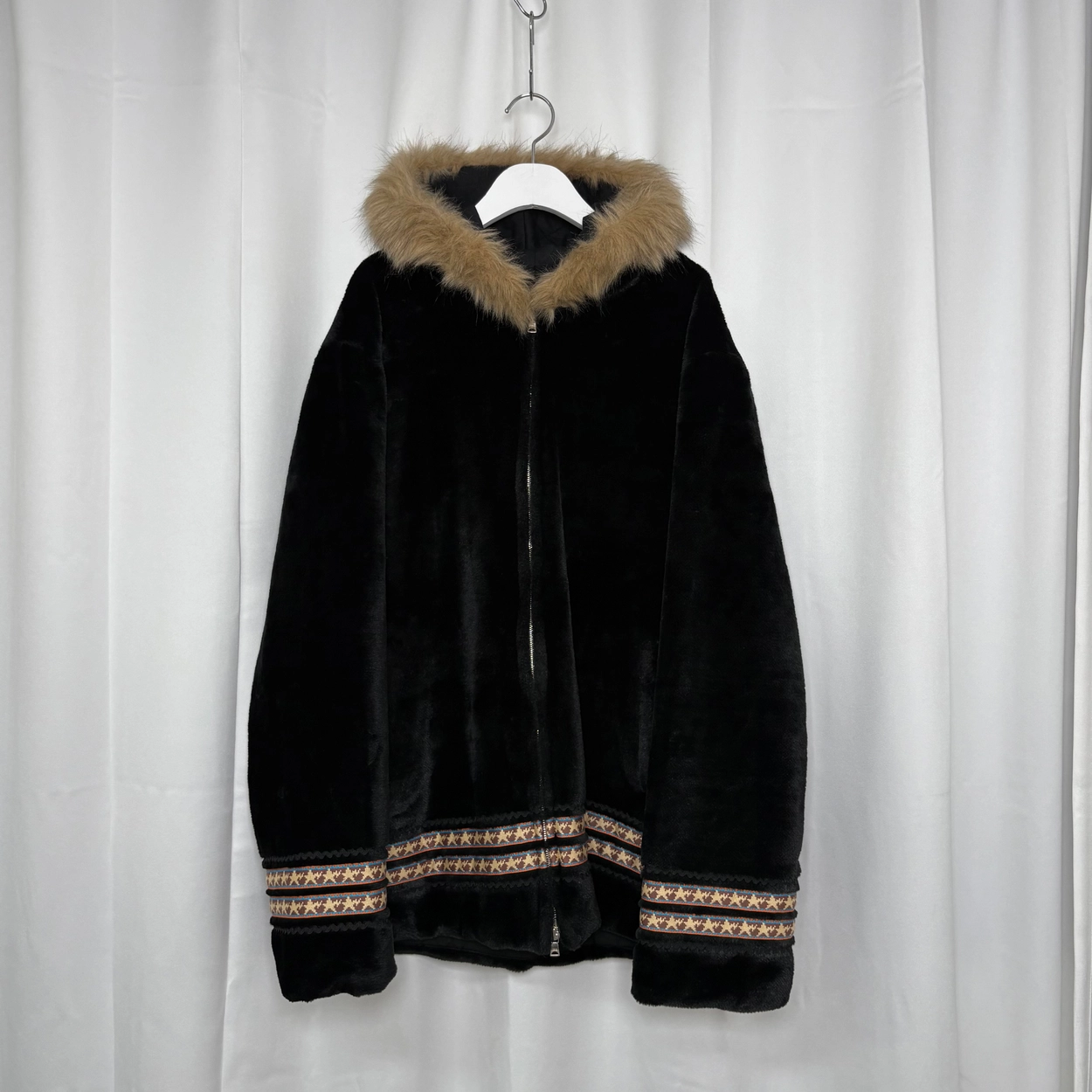 Black fur hood coat.